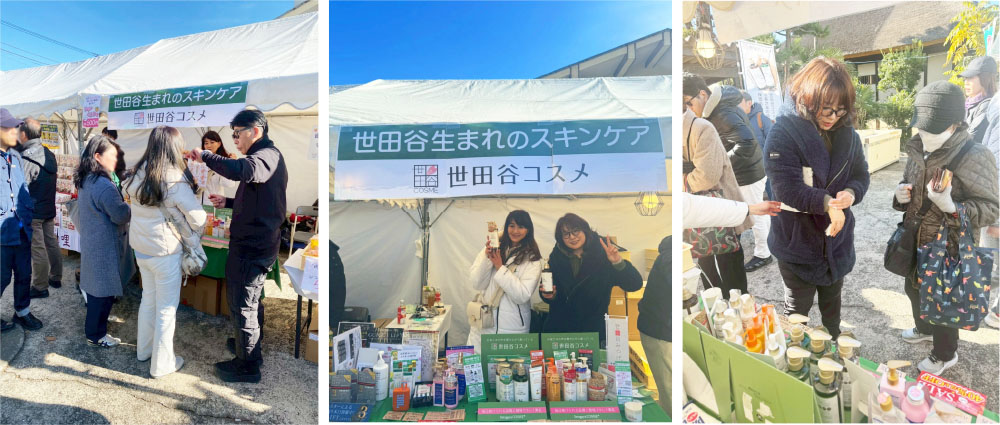 会場は、ボロ市通りの中心に位置する代官屋敷内敷駐車場にブースを構え、世田谷コスメを主に自社製品を販売しました。